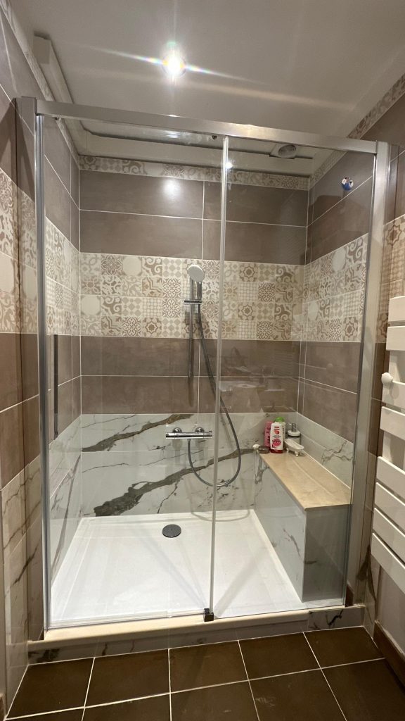 Salle de bain moderne et chic pour une atmosphère chaleureuse et confortable.